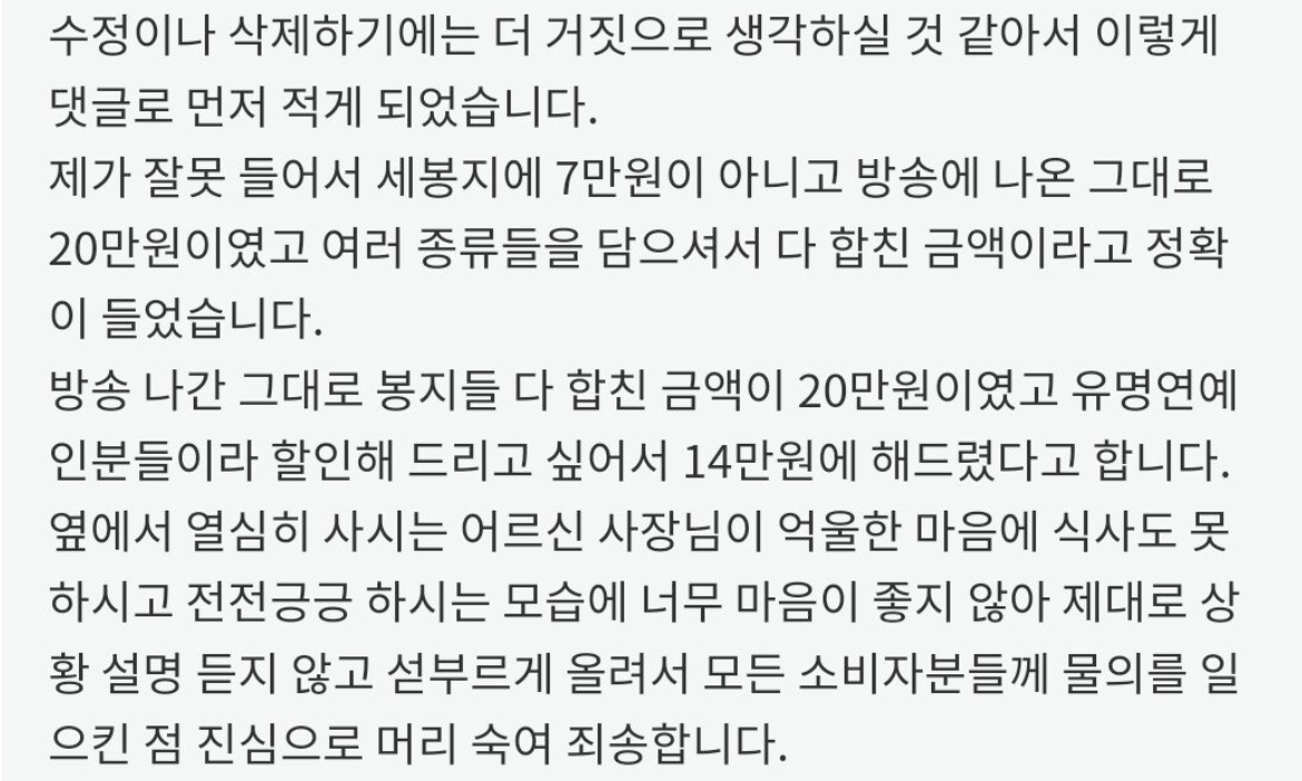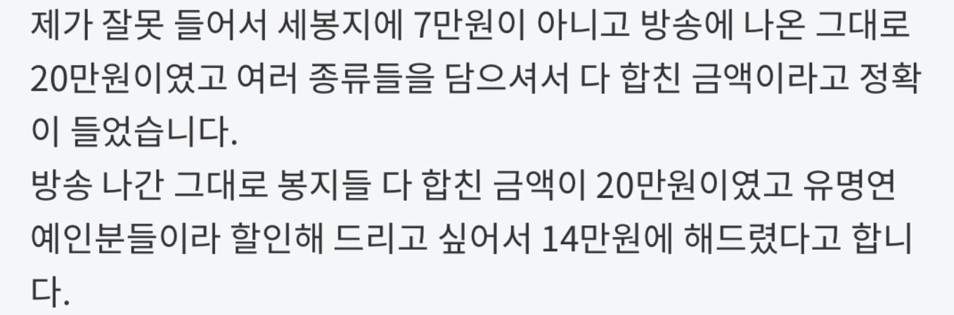 방송에 나간 그대로 세봉지 20만원이고 연예인들이라 좋아서 깎아준게 14만원인게 맞다는데?