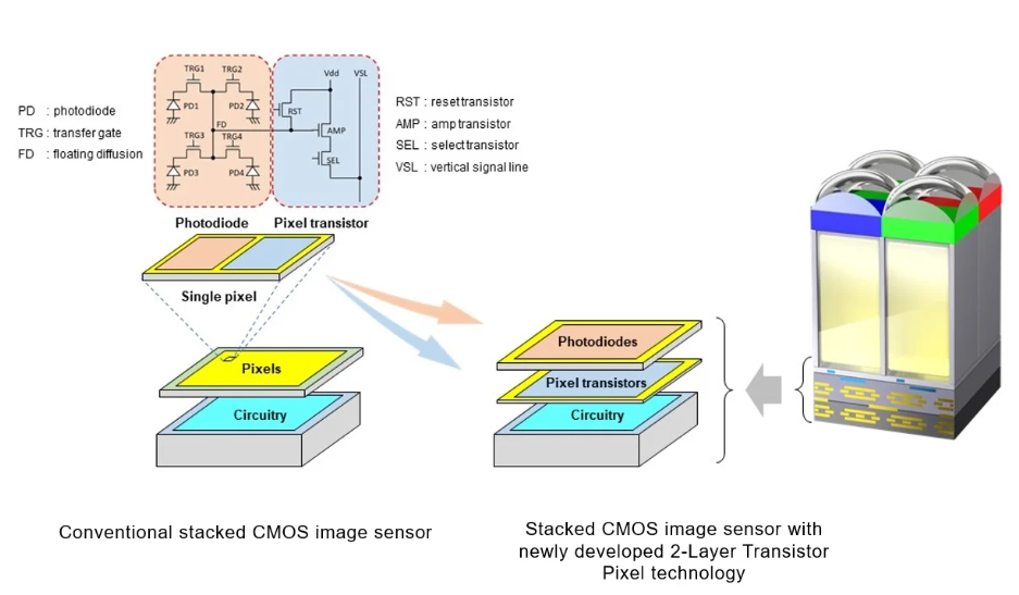 기존에는 포토다이오드, 픽셀 트랜시스터가 하나의 층을 나눠서 차지했지만