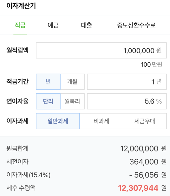 1년 기준으로 이자율이 최대 상태인 5.6%와 월 최대 100만 원을 적립했다면